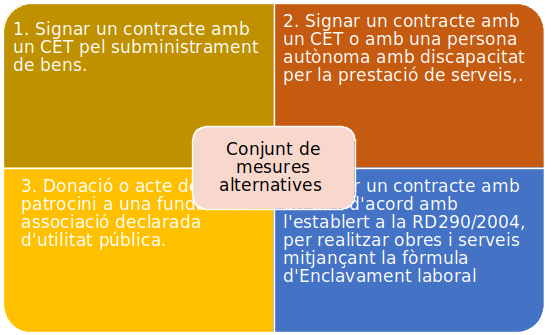 Aquestes queden recollides al REIAL DECRET 364/2005, de 8 d’abril i al DECRET 86/2015, de 2 de juny que regulen el compliment alternatiu amb caràcter excepcional de la quota de reserva a favor dels treballadors amb discapacitat.